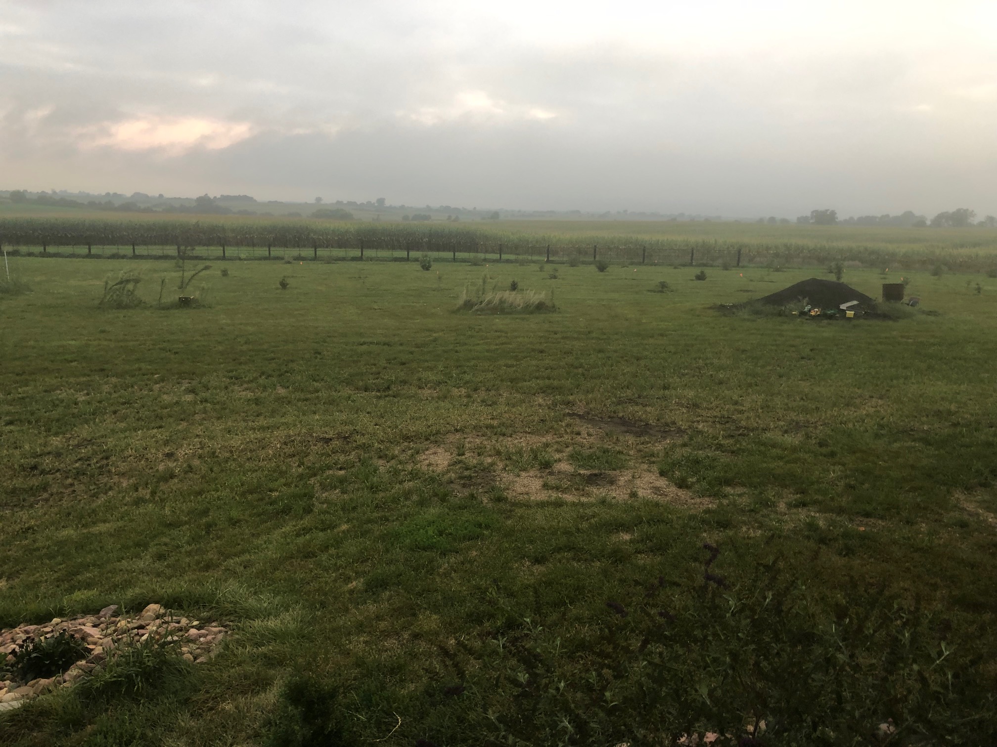 In the right picture you will see the North side of the windbreak. The row right after the evergreen trees are Elderberry and Aronia berry bushes. I panted them 10 feet apart and should have gone at least every 5. In front of the bushes is my orchard. I have planted different species of peach, pear, apple, and cherry trees. I also have blackberry and raspberry bushes planted on opposite sides of the orchard so they do not cross pollinate. As of the summer of 2024, we were getting lots of berries, a few apples, and a couple of pears. I have had to fungicide with Captain Jack’s Copper Fungicide and add neem oil to the mixture as an insecticide. The trees should be sprayed every 10 days or so to keep disease and critters at bay. I had no idea that fruit trees would need so much attention!