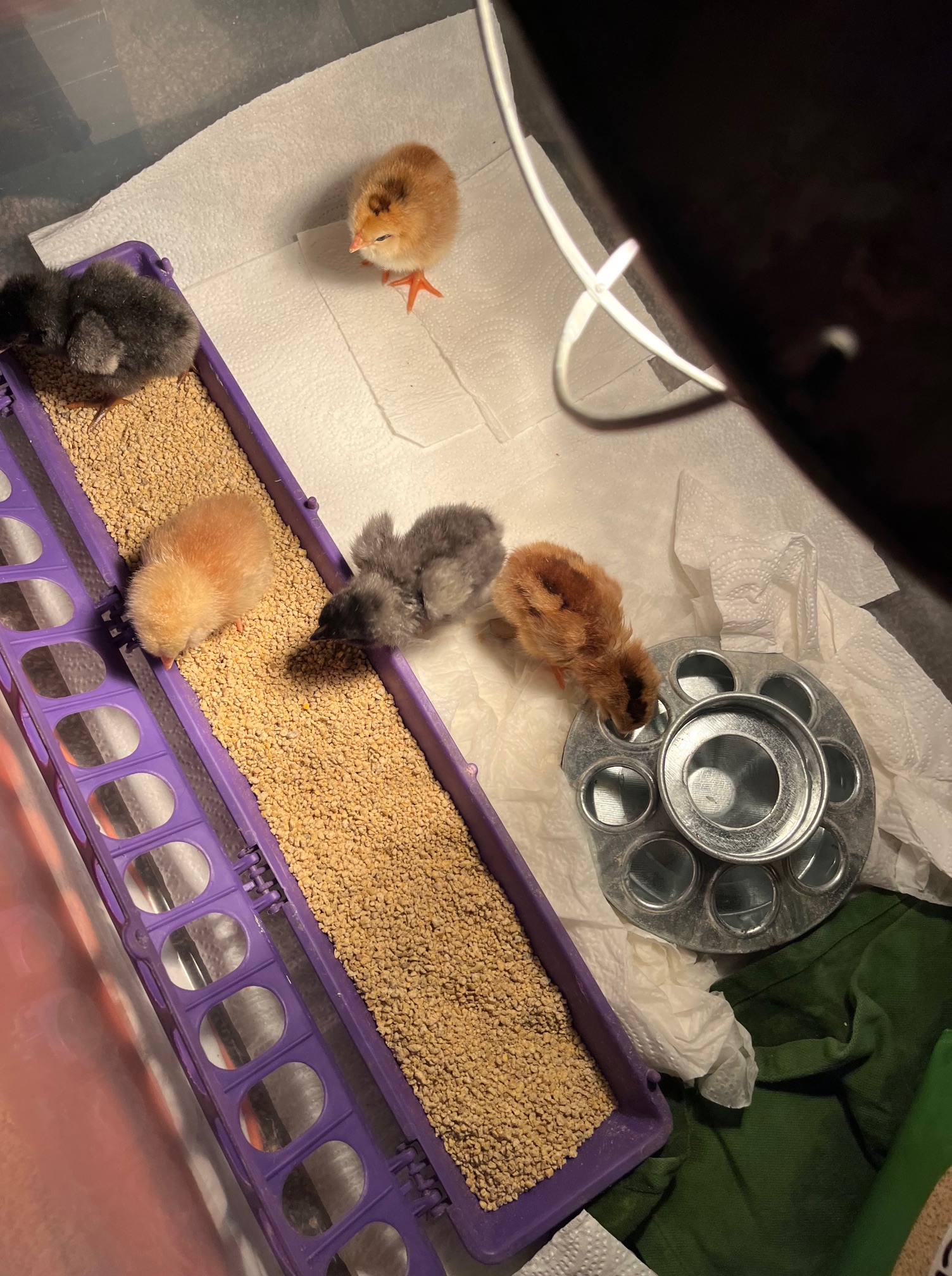 The chicks hatched and the care began immediately. We kept the babies in a large Tupperware container with food, water, and heat lamp. The bottom we cover with pine shavings to absorb droppings and spilled water from these messy kids.
