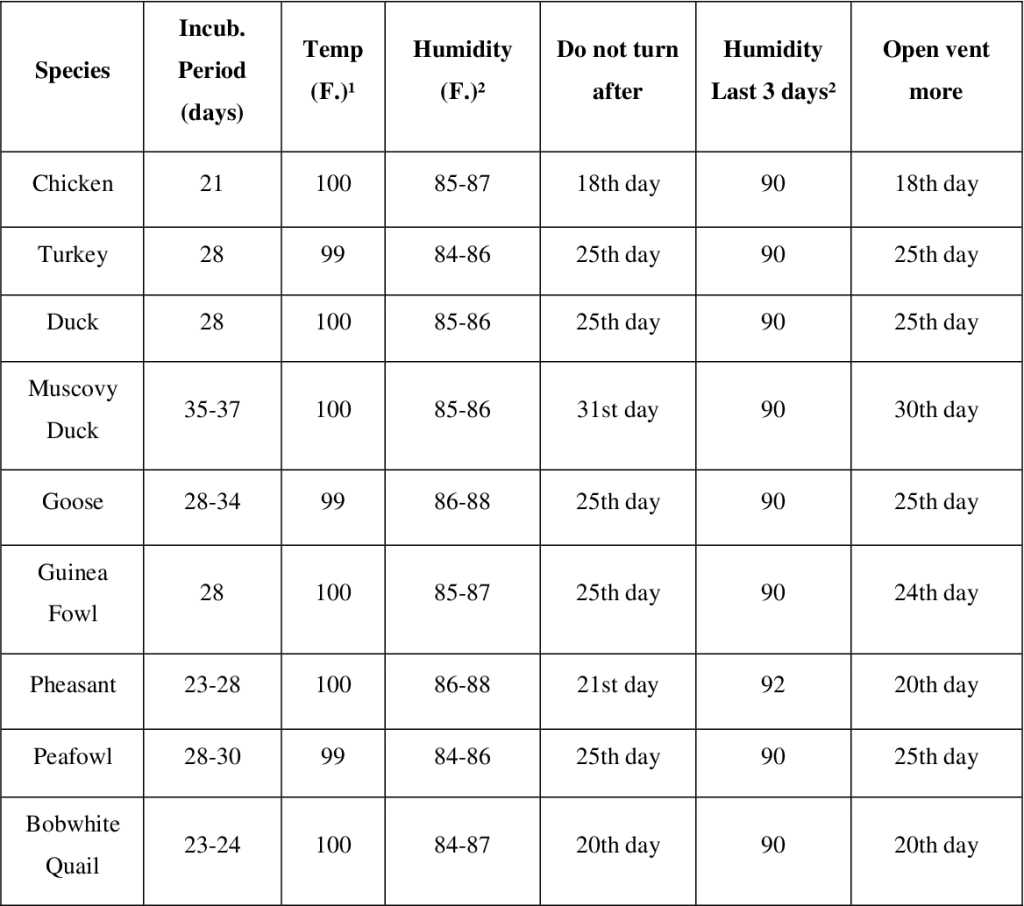 Last year, instead of ordering chicks in the mail, we decided to hatch our own eggs. We had to do some research of how to use an incubator. There are all kinds of incubators, but we chose one that you can set the temperature, humidity, and had an automatic egg turner. For chickens, we set the temperature to 99.5 and the humidity setting changed depending on the incubation day of the egg. But if you hatch a different species, then you will want to reference a chart like the one below for guidance.